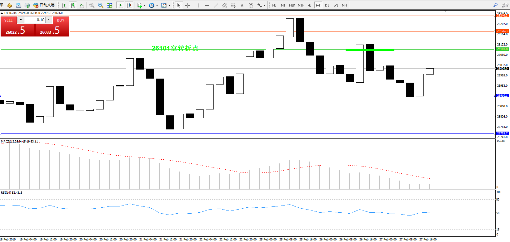 道琼斯指数DJ30—— 4小时K线图显示: