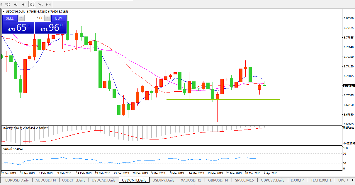 技术面简析:日线图均线粘合无方向,MACD在0轴附近徘徊且动能柱量能萎缩,RSI缓步走低,汇价企稳多空转折区域开始整理,短期走势或取决于中美经贸磋商最新进展。