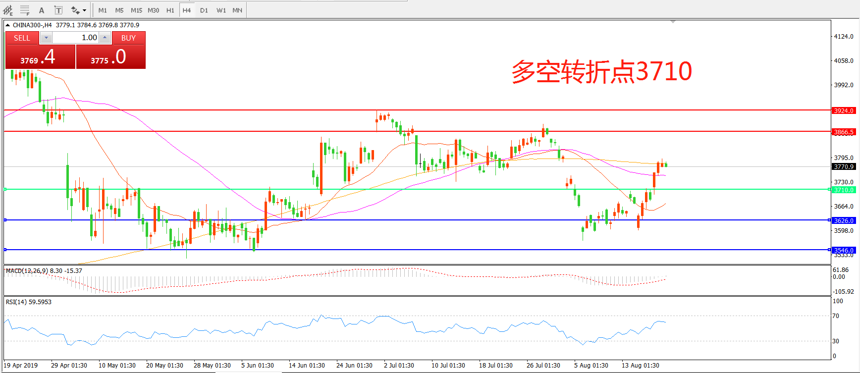 4小时图看,沪深300指数强势反弹后陷入整理,均线系统走平,MACD绿柱减少,红柱增加,RSI指标向上,日内延续上行概率较大。