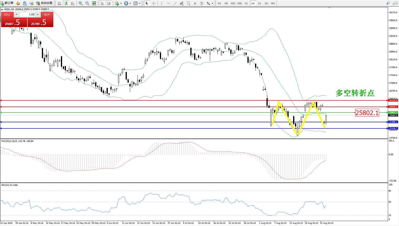 香港恒生指数8月26日(周一)收盘下跌499.00点,跌幅1.91%,报25680.33点;贸易紧张局势影响持续发酵,令市场对全球经济前景的担忧显著升温,本周一延续上周五欧美股市跌势,美联储将在9月货币政策例会上再次下调联邦基金利率。美联储7月31日宣布将联邦基金利率目标区间下调25个基点到2%至2.25%的水平,是2008年12月以来首次降息;商务部新闻发言人就美方宣布进一步提高对中国输美商品加征关税税率发表谈话称,8月24日,美方宣布将提高对约5500亿美元中国输美商品加征关税的税率,中方对此坚决反对。