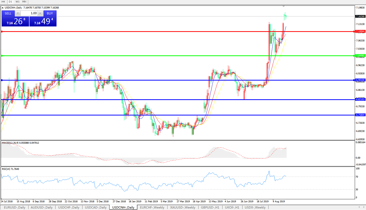 技术面简析:日图均线再度呈有序多头排列,汇价高位维持强势,MACD运行在0轴上方且动能有再度放量迹象,RSI超买区域略走低,预计汇价将维持攻势,重点关注7.20-7.30区间的压制;中美贸易战后续进展决定汇价中期走势。