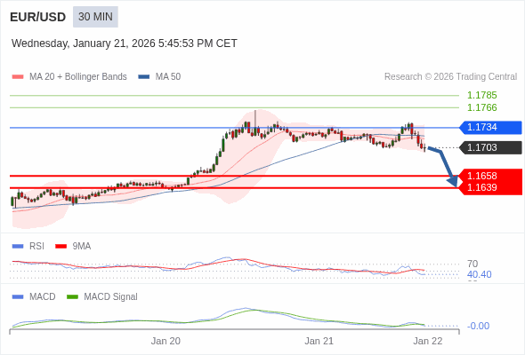 欧元/美元 当日内 : 看跌,在 1.1734 之下。