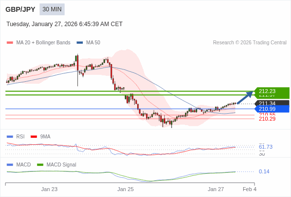 英镑/日元 当日内 : 看涨,当 210.99 为支撑位。