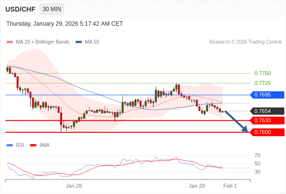 在 0.7695 之下,看跌,目标价位为 0.7630 ,然后为 0.7600 。