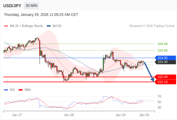 交易策略: 在 153.55 之下,看跌,目标价位为 152.40 ,然后为 152.10 。