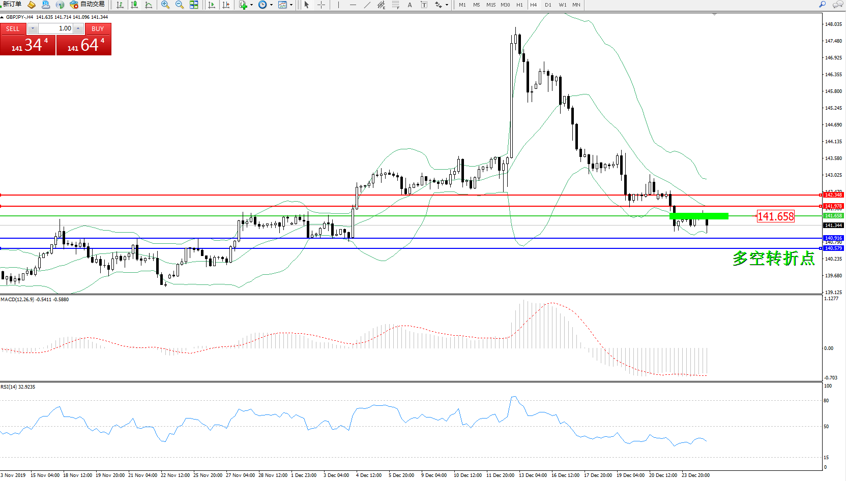 交易策略:141.658下方看跌,目标140.916140.579