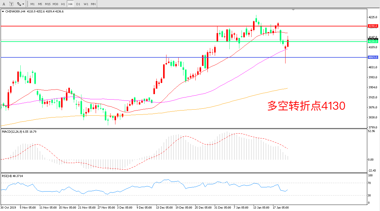 4小时图看, 沪深300长针探底,显示下方支撑较强,整体走势偏向强势,均线系统呈多头排列,MACD红柱减少,RSI指标走平,日内震荡上行概率较大。