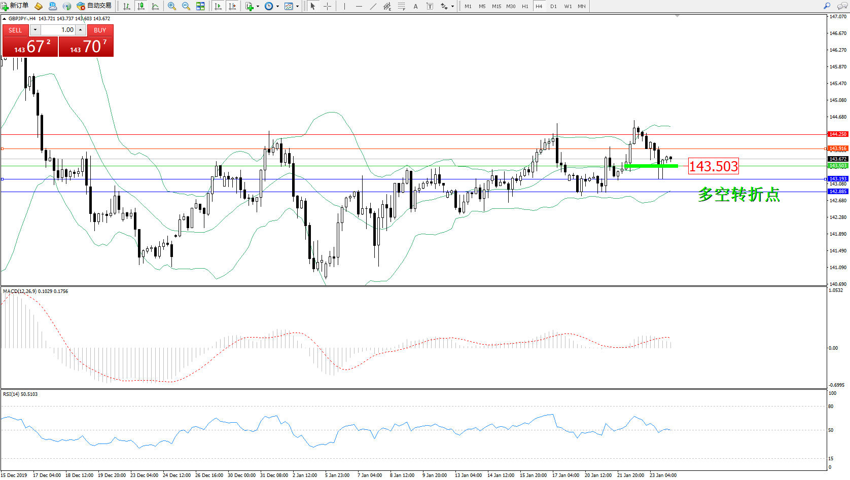 交易策略:143.503下方看跌,目标143.193、142.885