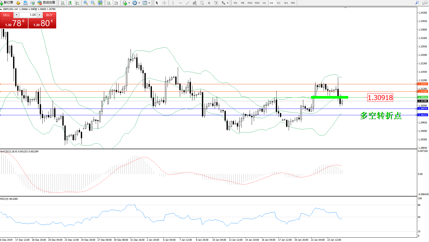 交易策略:1.30918下方看跌,目标1.304741.30222