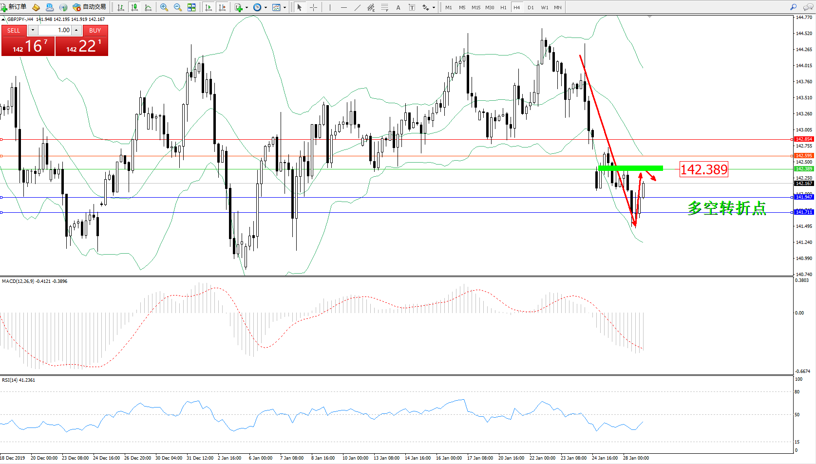 交易策略:142.389下方看跌,目标141.947、141.711