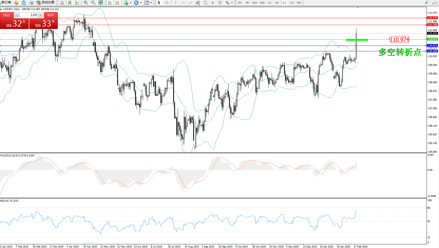 技术点评:多头动力强势拉升上扬,突破布林带指标上轨后有继续上行态势,且布林带指标有张口迹象,前期高位112.173附近压制或将有再次触及可能性,MACD指标处于多头区域高位整理后出现拉升走势,RSI指标处于多头区域持续整理后出现上行态势;