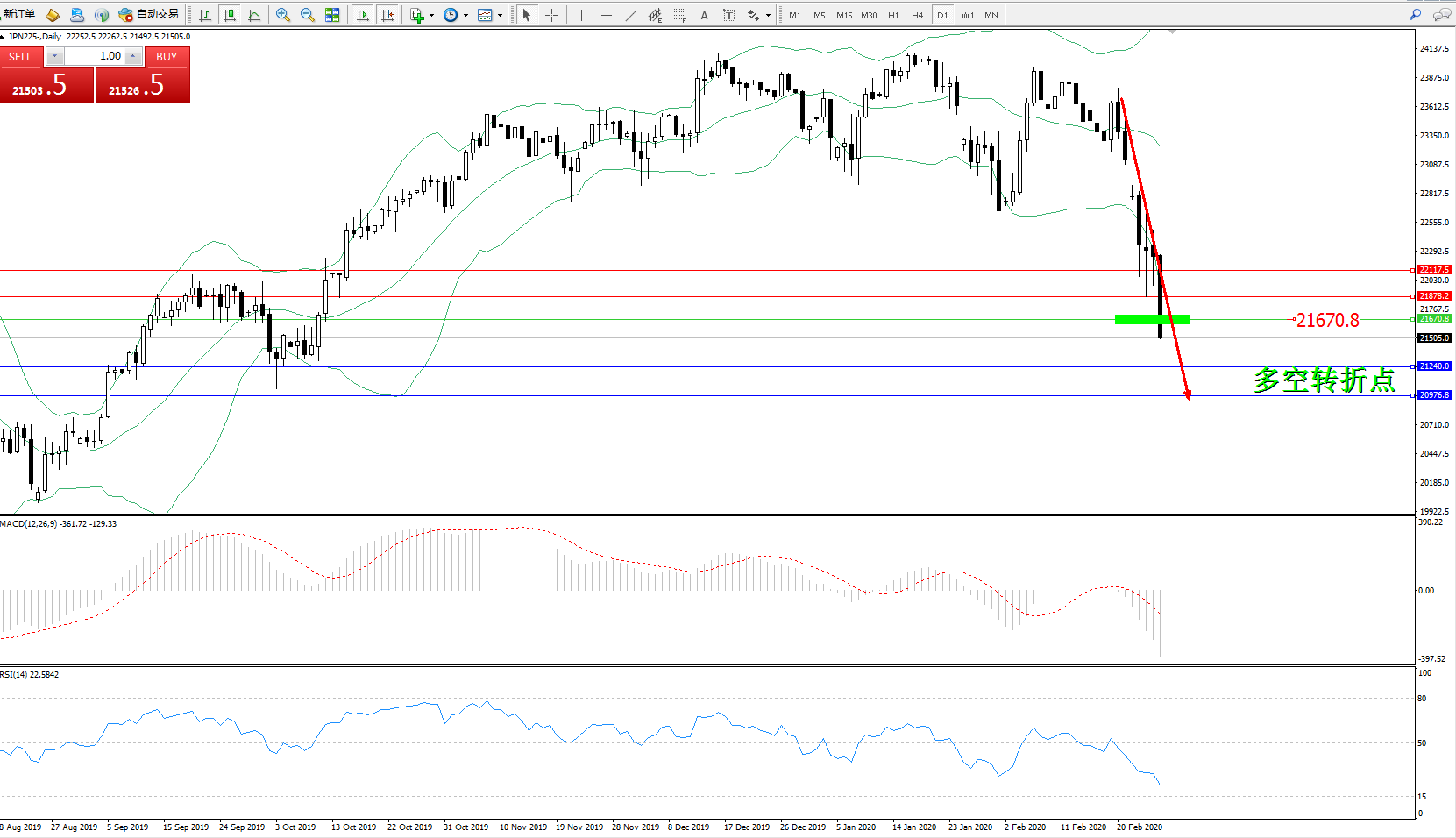 日经225指数227日(周四)收盘下跌463.69点,跌幅2.07%,报21962.50点。对公共卫生事件爆发将削弱全球增长的担忧惊扰了市场,再加之人们预期各地将放松货币政策。尽管日本央行的政策利率多年来一直维持在负数水平,但它在促进经济增长和通胀方面无济于事。此外,日本央行将政策利率和短期利率维持在-0.1%的水平,并将十年期政府债券的收益率控制在0%左右(收益率曲线控制)。最近有传言称日本央行可能需要进一步宽松。该央行最鸽派成员之一片冈刚士近日表示,日本央行下调利率是合理的,日本经济面临下行风险,个人对前景更加谨慎,准备在必要时表示毫不犹豫宽松政策。