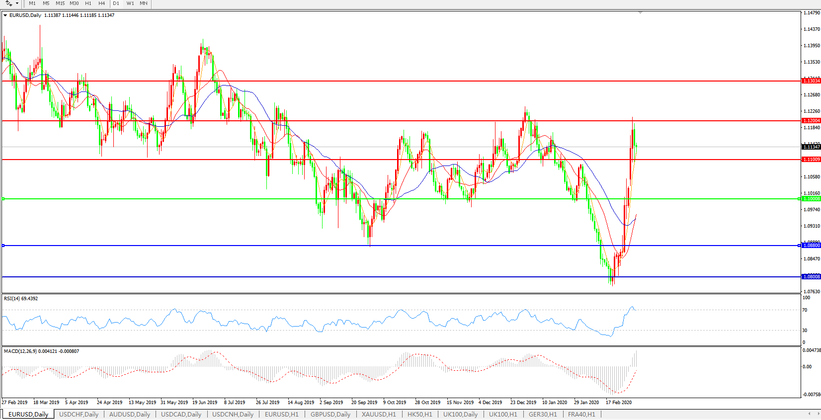 交易策略:1.1000上方看涨,目标1.1100、1.1200、1.1300