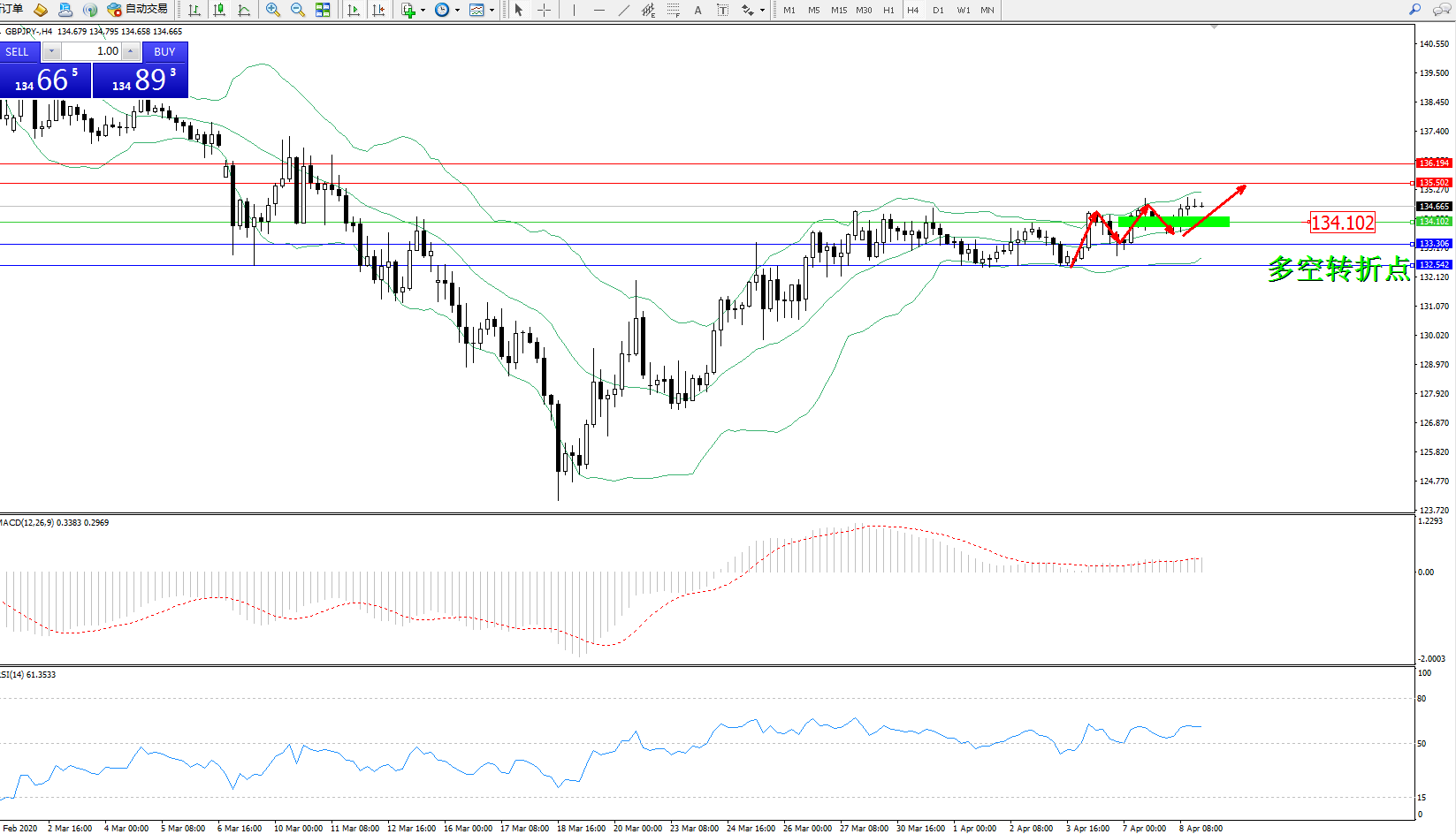 交易策略:134.102上方看涨,目标135.502、136.194