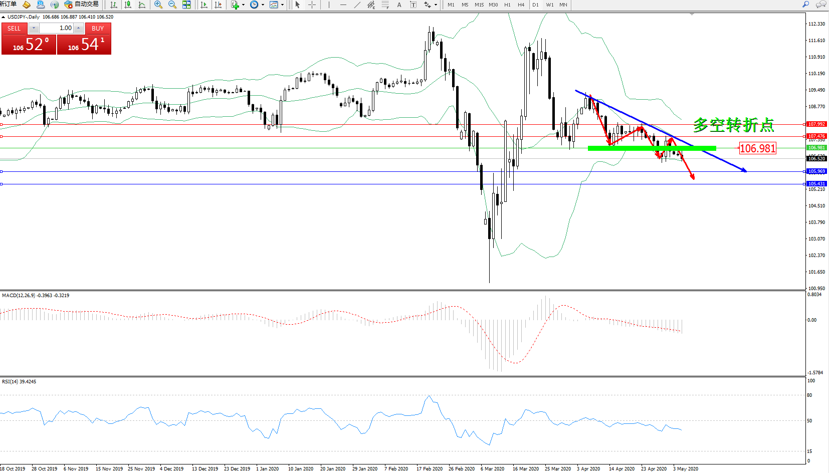 交易策略:106.981下方看跌,目标105.969、105.431