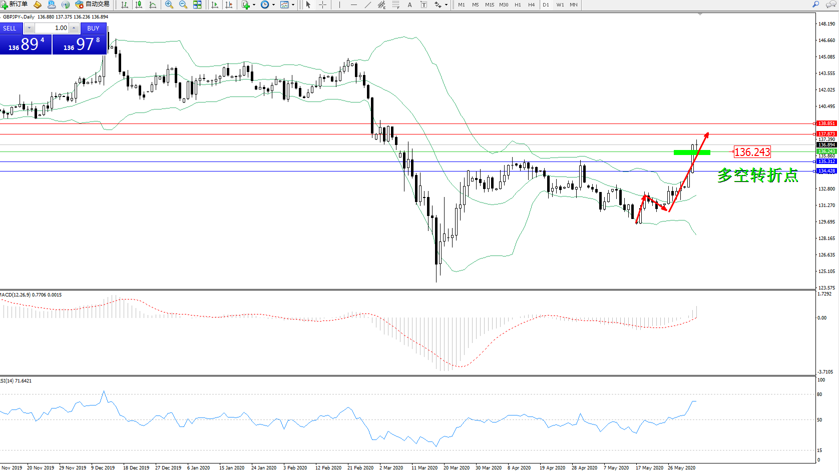 交易策略:136.243上方看涨,目标137.873138.851