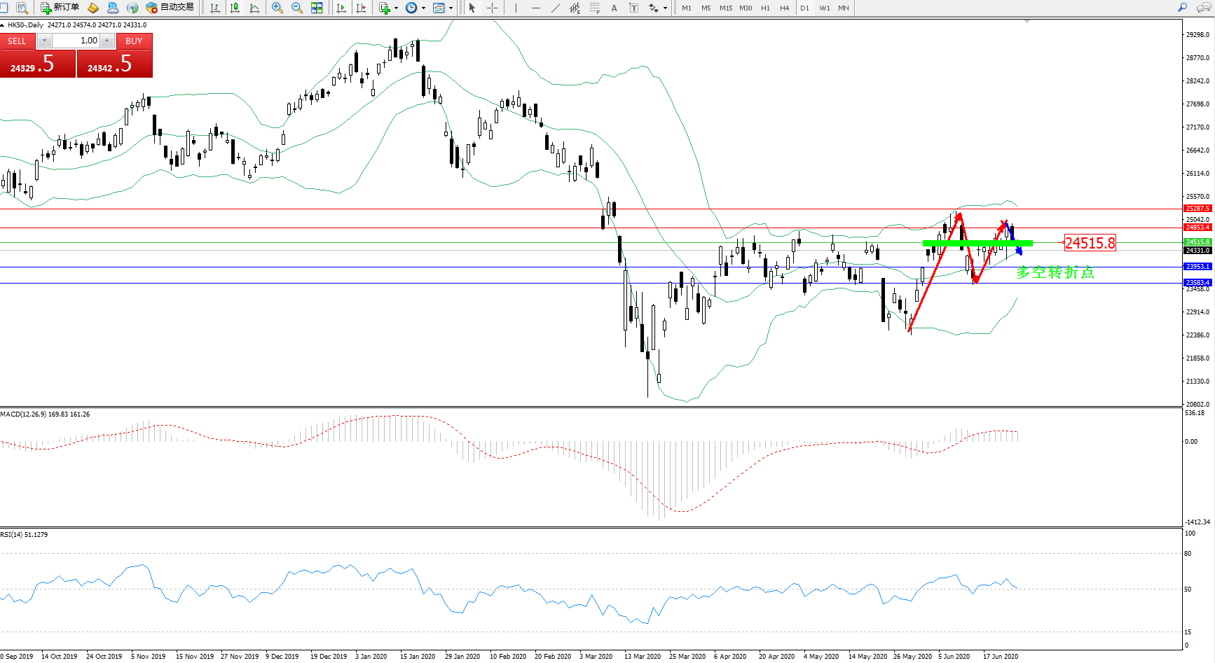 香港恒生指数626日(周五)收盘下跌231.59点,跌幅0.93%,报24549.99点;港股三大指数全日走弱,国指跌0.84%9853点。大市交易较为清淡,成交额不足千亿港元。因端午节假期,港股本周仅4个交易日。恒指本周累计跌幅达0.38%,最高点为25071.32点,最低点为24184.88点。半导体逆势领涨,华虹半导体大涨近6%,中芯国际升超4%再创新高;手机概念股、生物医药股普涨,舜宇大涨超5%领涨蓝筹;盘中再次破顶;腾讯跌超1%,拖累恒指下跌35点;国美系分化严重,拉近网娱大幅收涨超52%,国美零售大跌8.64%。港股延续近期强势,并沿上升通道挺进,但上方压力开始浮现,由于累积较大获利需求,短线大盘或需进行休整,但预计行情整固过后,港股仍将延续上行趋势,投资者可根据自身仓位适度调整持仓水平。