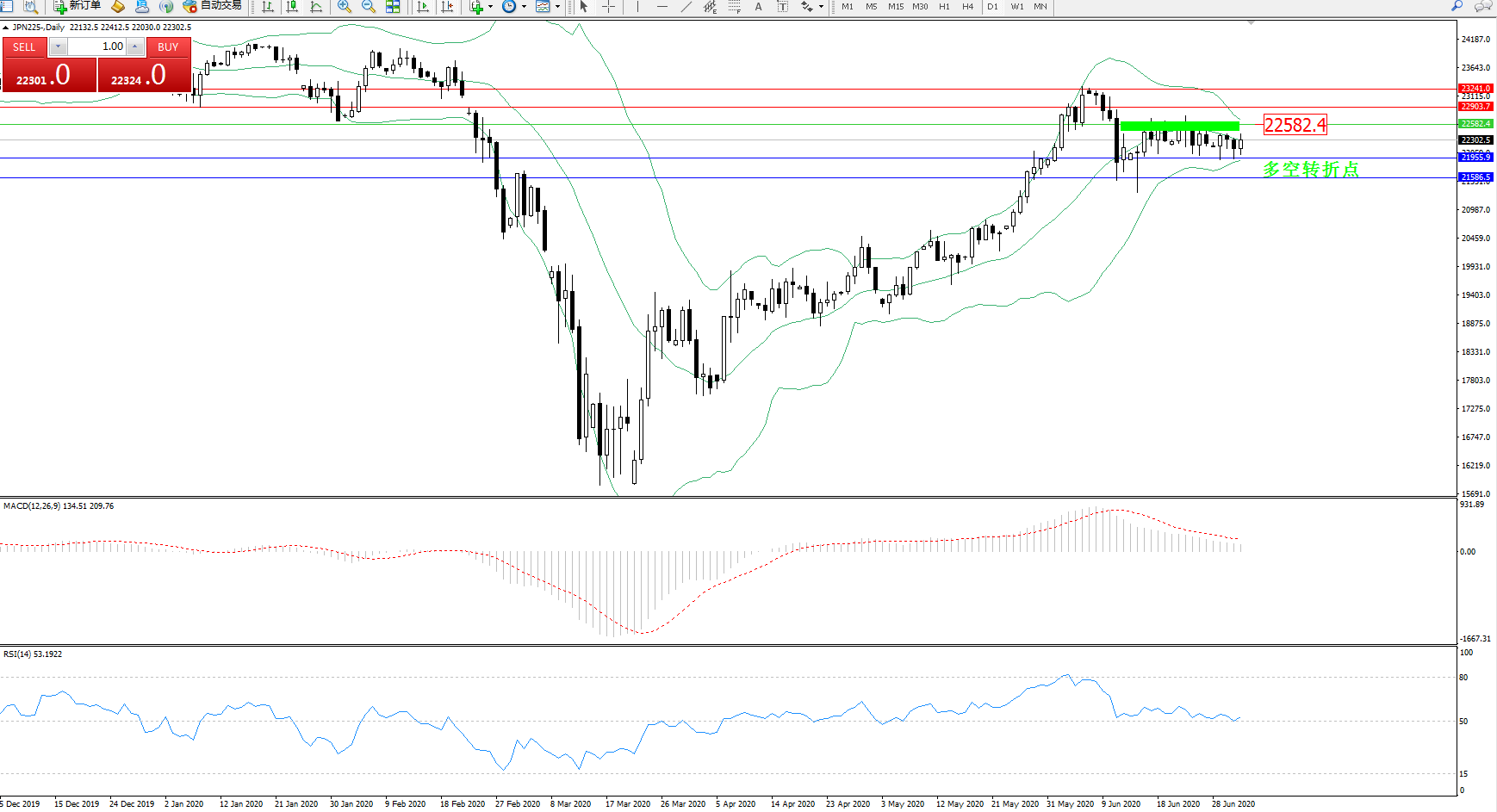 日经225指数72日(周四)收盘上涨6.27点,涨幅0.03%,报22128.00点。日本首相安倍晋三:密切关注东京疫情局势,就疫情问题与东京政府密切合作,亚洲股市追随欧美股市上涨,风险偏好得到支撑。离岸资金流入区域股市指数。美联储在6月初的货币政策会议上没有表现出实施收益率曲线控制措施的意愿,但确实表示渴望在未来几个月内就利率路径和资产购买前景提供更多指引。美国6月新增480万个岗位,创历史新高。失业率降至11.1%,但病毒大流行使就业人数进一步增长的前景黯淡。美国非农就业数据公布后美股三大股指期货迅速上扬。