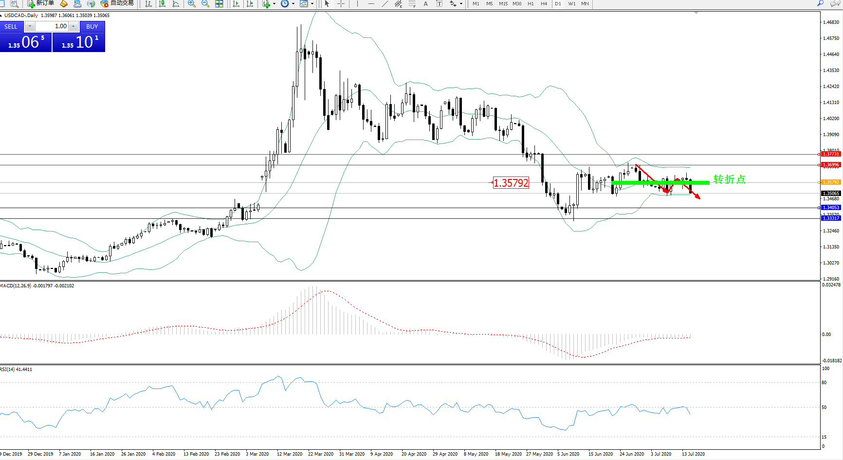 美元加元USDCAD——日K线图显示: