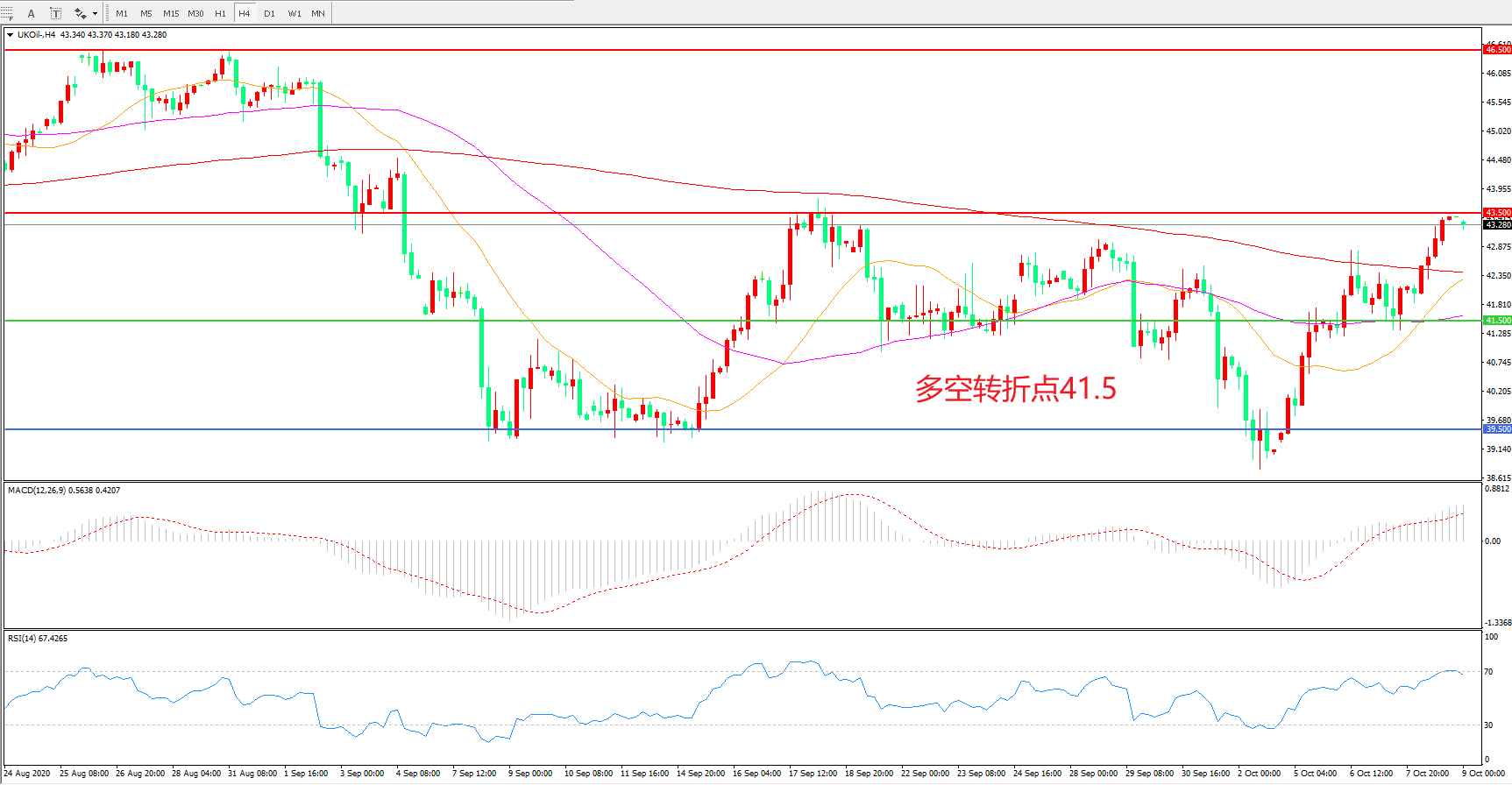 4小时图看,油价阳线连续拉升,短期表现较为强势,200周期均线被顺利突破,短期均线拐头向上,MACD红柱增加,RSI指标走平,日内延续上行概率较大。