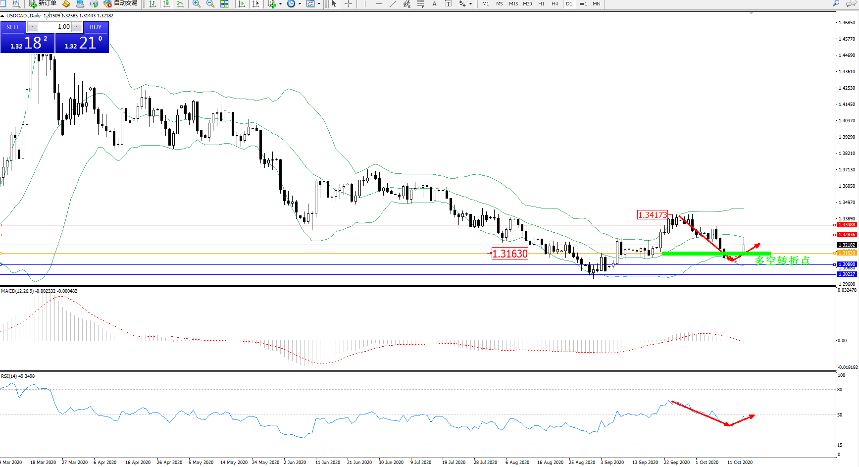美元加元USDCAD——日K线图显示:
