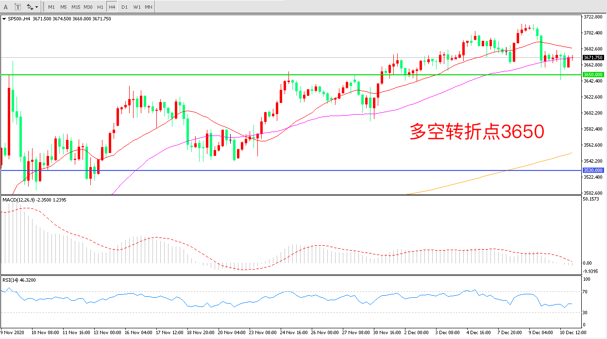 4小时图看,标普500延续高位震荡短期涨势遭到破坏均线系统呈多头排列3650成为下方支撑 MACD红柱减少RSI指标走平,日内延续震荡概率较大