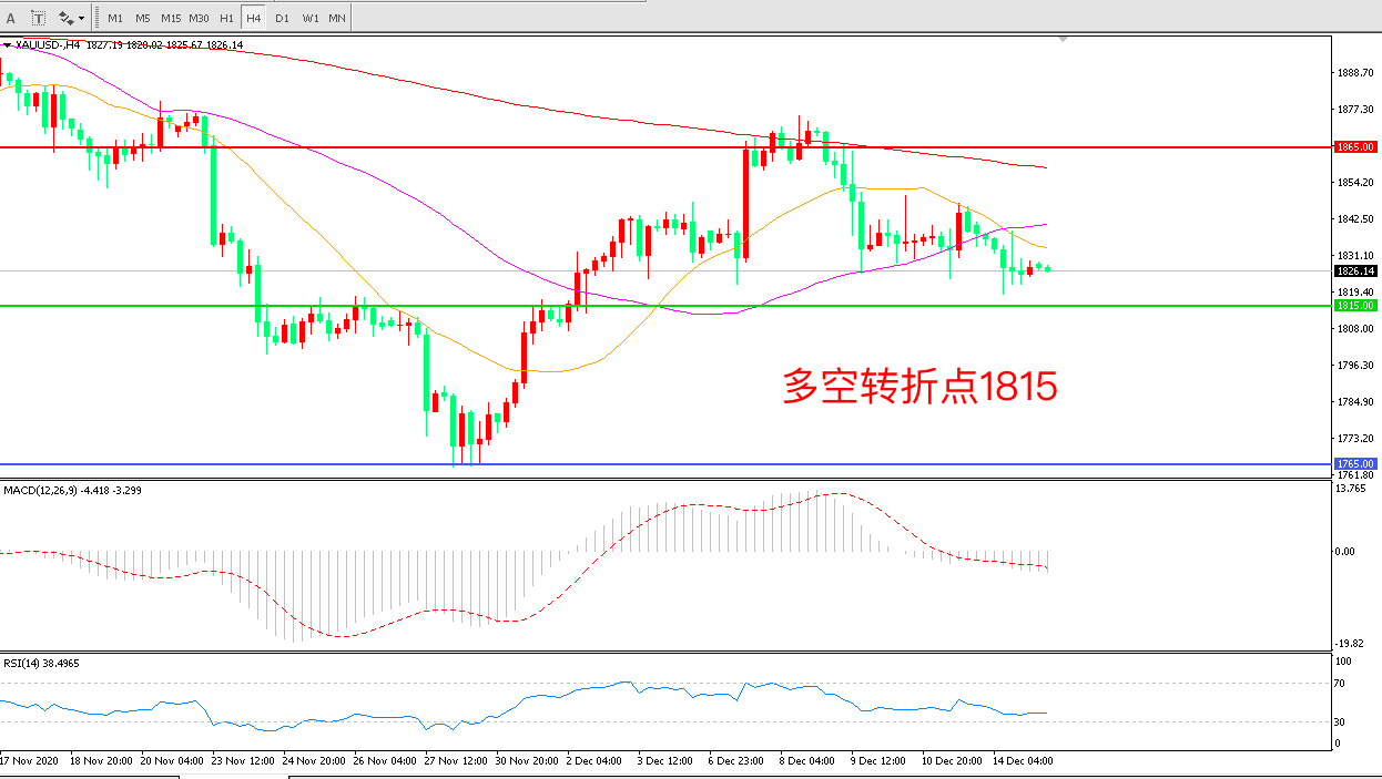 周一(12月14日),英国与欧盟延长脱欧贸易谈判,美国开始接种新冠疫苗,市场避险情绪回落,金价延续弱势震荡,收报1826.14美元/盎司。美元指数大幅反弹带给金价沉重的下行压力,而美国开始接种新冠疫苗推动了更广泛金融市场的乐观情绪,投资者寄望于由此带来的经济复苏,削弱了黄金的避险需求。