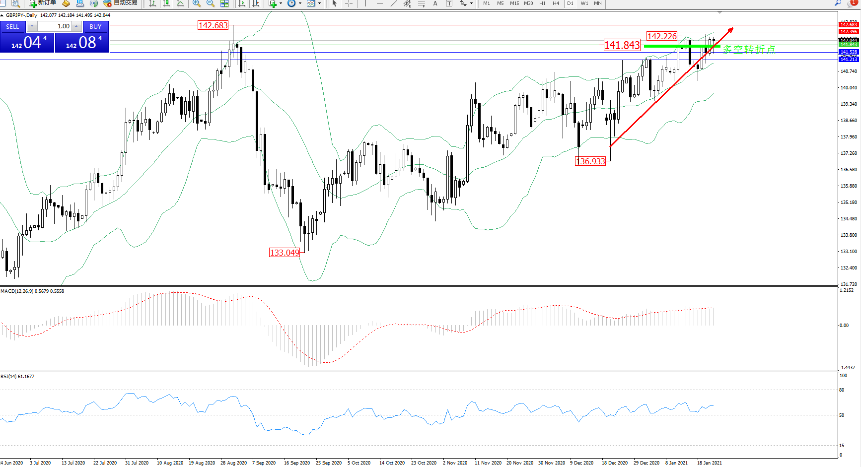 备选策略:141.843下方看跌,目标141.528、141.213