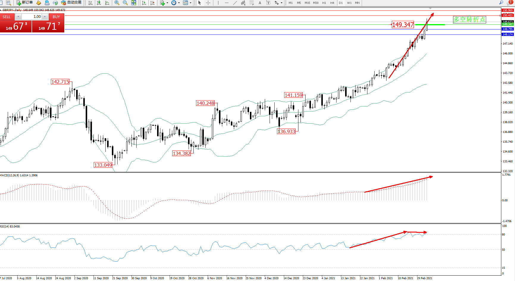 英镑兑日元高位149.664附近持续震荡,如果英国全面普及注射疫苗达到的效果好于之前预估,该国政府将有望在今年6月21日时撤除所有社交管控措施。英国抗疫限制措施将逐步解除引发的乐观情绪促使空头回补。在英国首相约翰逊22日提出4阶段解封计划后,夏季假日旅游预订量激增600%,这让遭受疫情重创的航空公司和旅游运营商重新燃起了希望;英国首相约翰逊:预算将帮助进行自我隔离的人,英国的国内旅游最早可能从4月12日恢复,海外旅行可能从5月17日恢复。穆迪下调对英国增长预测 因疫情造成的损失惊人;新冠疫情给全球经济活动造成的损失令人震惊,尽管经济也显示出出色的韧性。新冠疫情危机将持续对世界经济构成挑战,远远超出我们的两年预测时间跨度。