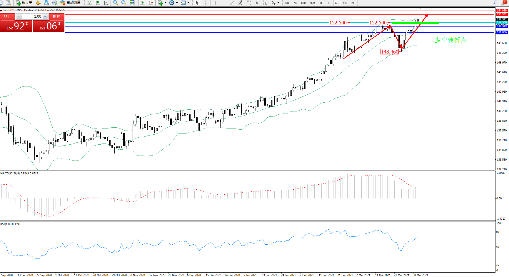 英镑兑日圆上行至152.922附近震荡,英国工厂3月迎来一大波订单,并在为经济从防疫关停中逐步重启做准备,招聘员工的步伐创自2014年以来最快。IHS Markit/CIPS英国3月制造业采购经理人指数(PMI)终值从初值57.9上修至58.9,创逾10年最高位。英国的新冠疫苗接种进展迅速,预计将在今年带动经济复苏。英国经济2020年萎缩近10%,是近300年来最严重的萎缩。新订单增速为三年多来第二快,因企业为放松限制做好准备。非必需品商店和户外服务将在4月12日重新营业。不过,供应链交货延迟时间拉长的幅度位于纪录前列,给PMI带来提振,与没有延迟的情况相比,这次延迟让PMI增加了逾4点。尽管延迟在正常情况下是需求强劲的迹象,但IHS Markit表示,抗疫封锁限制、全球航运中断和英国退欧导致的繁琐手续,致使供应商交货时间大幅延长。