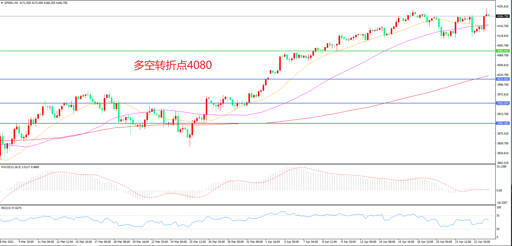 上周五(4月23日),美国4月制造业和服务业PMI均创新高,3月新屋销售户数创2006年来新高,靓丽的经济表现激发了市场对经济复苏的乐观情绪,标普500在大幅反弹,收报4166.75点。大型科技股中仅跌逾0.6%奈飞收跌,谷歌母公司Alphabet涨超2%,苹果涨1.8%。