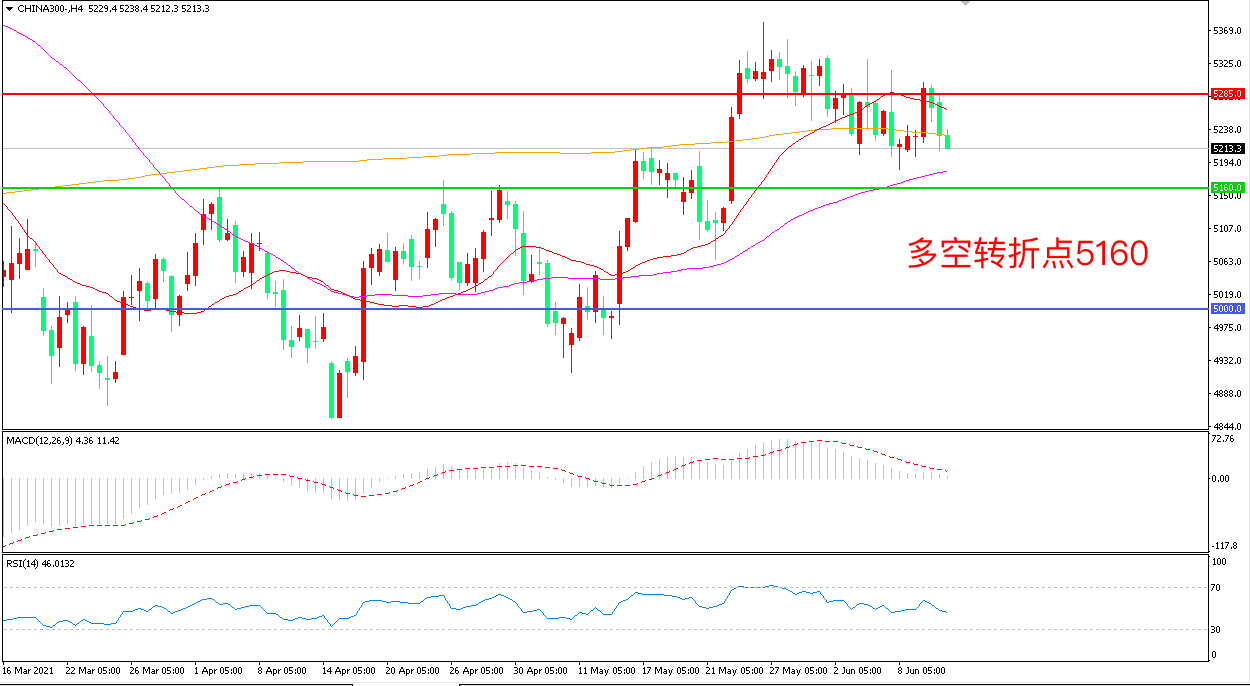 4小时图看,沪深300延续高位震荡,振幅逐渐收窄,5285成为上方阻力,55周期均线成为下方支撑,MACD红柱缩短,RSI指标走平,日内震荡上行概率较大。