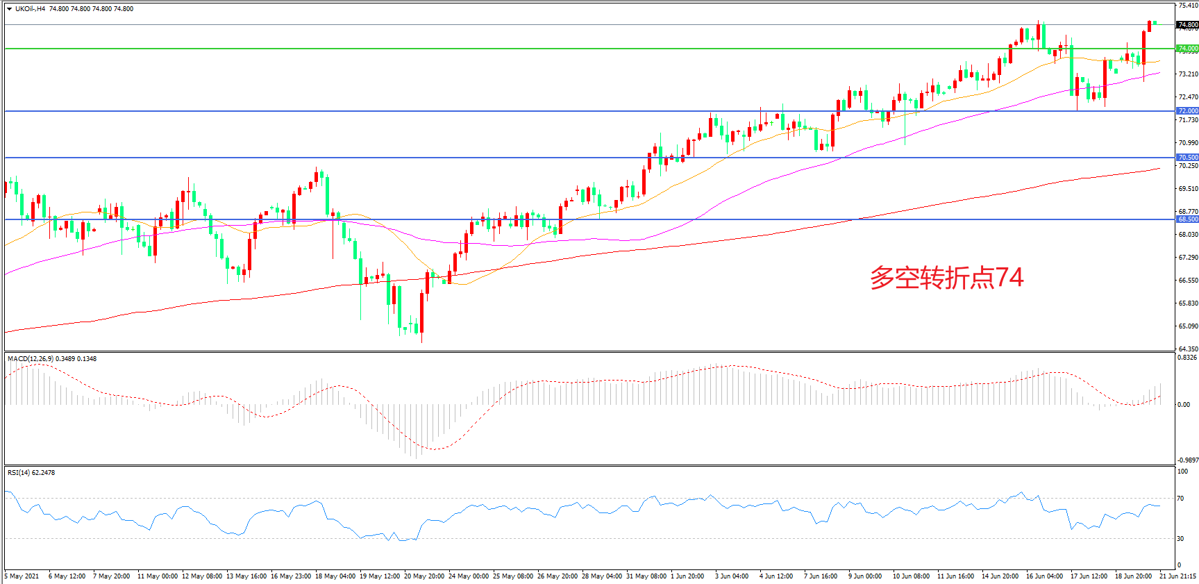 4小时图看,油价长阳拉升,强势突破74美元阻力,短期表现强势,均线系统成为下方支撑,MACD红柱增加,RSI指标走平,日内震荡上行概率较大。