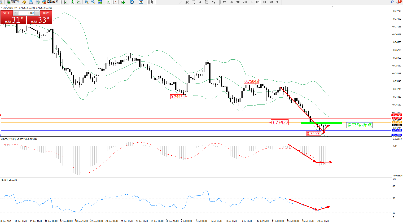 交易策略:0.73427下方看跌,目标0.73111、0.72926