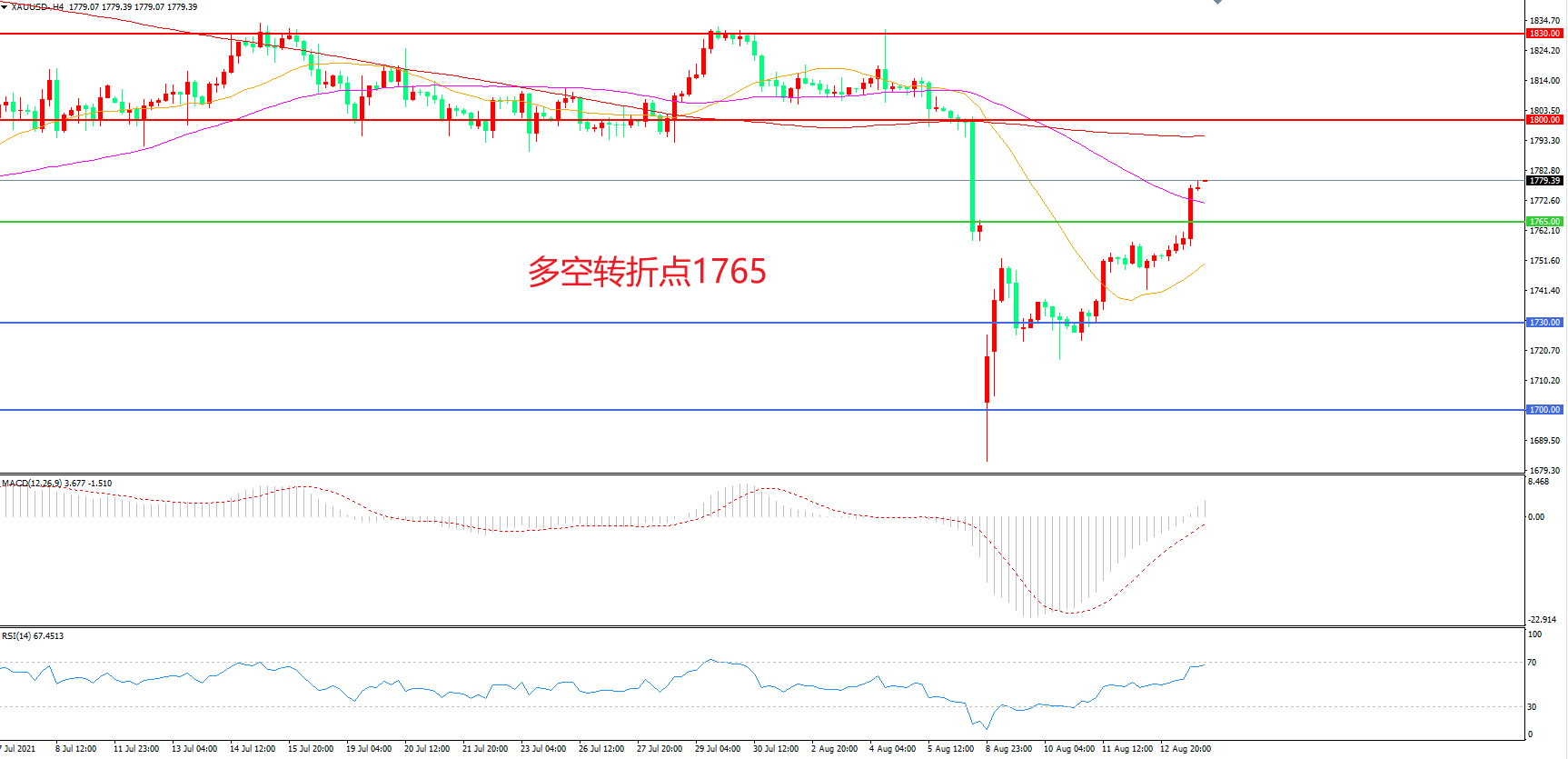 交易策略:  在1765.00之上看涨,目标1800.00           1830.00