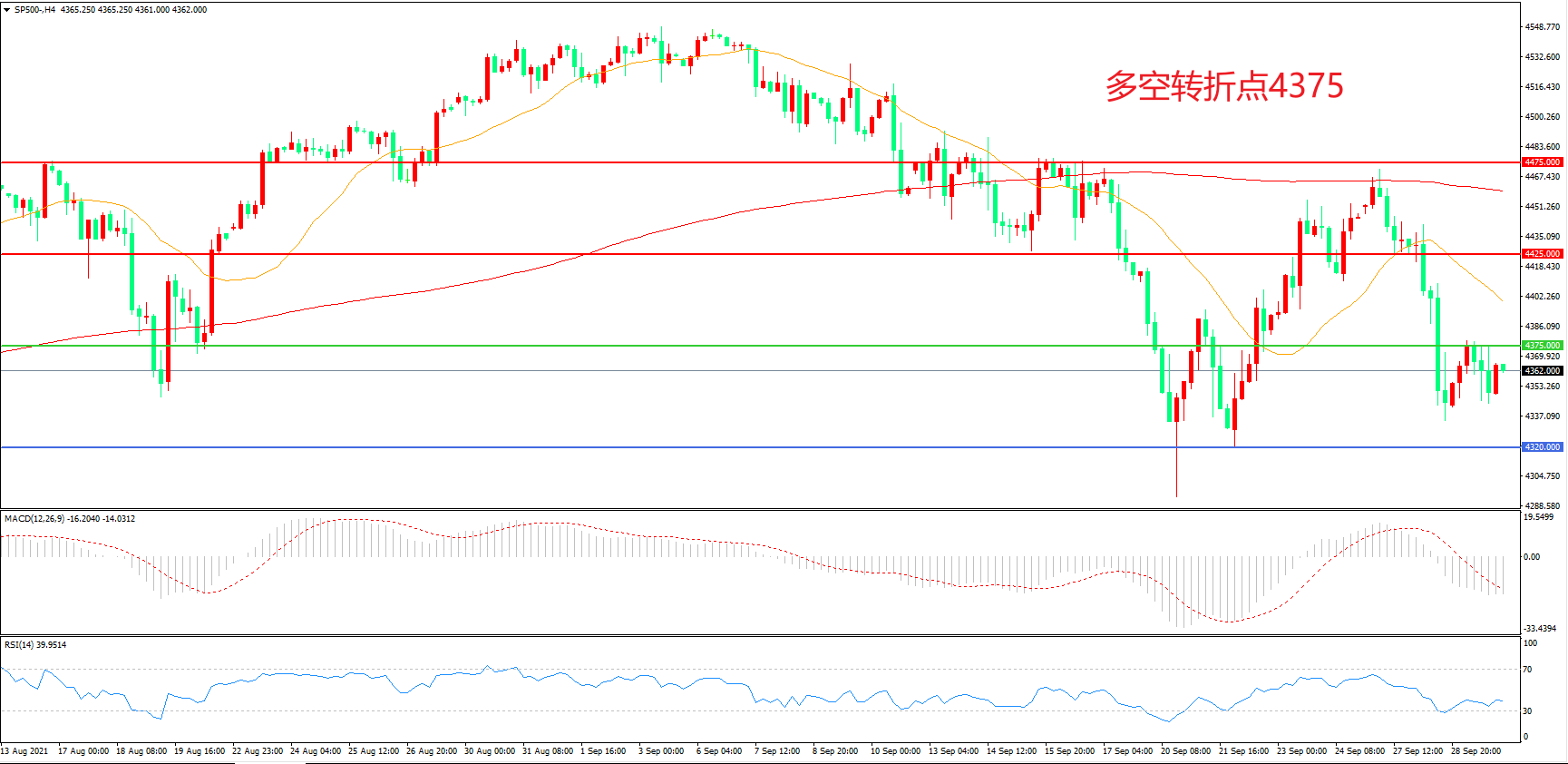 4小时图看,标普500长阴下破后无力反弹,整体走势偏空,短期均线拐头向下, MACD绿柱增加,RSI指标走平,日内震荡下行概率较大。