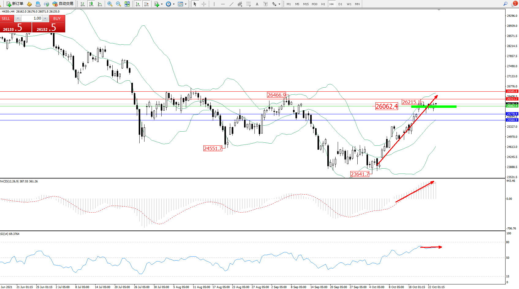 技术点评:多头动力延续布林带指标通道中上轨区间持续震荡上扬,高位抵达26215位置后开始短暂整理,但多头上扬态势良好,短期依旧有进一步上扬态势,布林带呈上行趋势走势良好,MACD指标处于多头区域高位维持走平,RSI指标处于多头区域高位持续整理中;