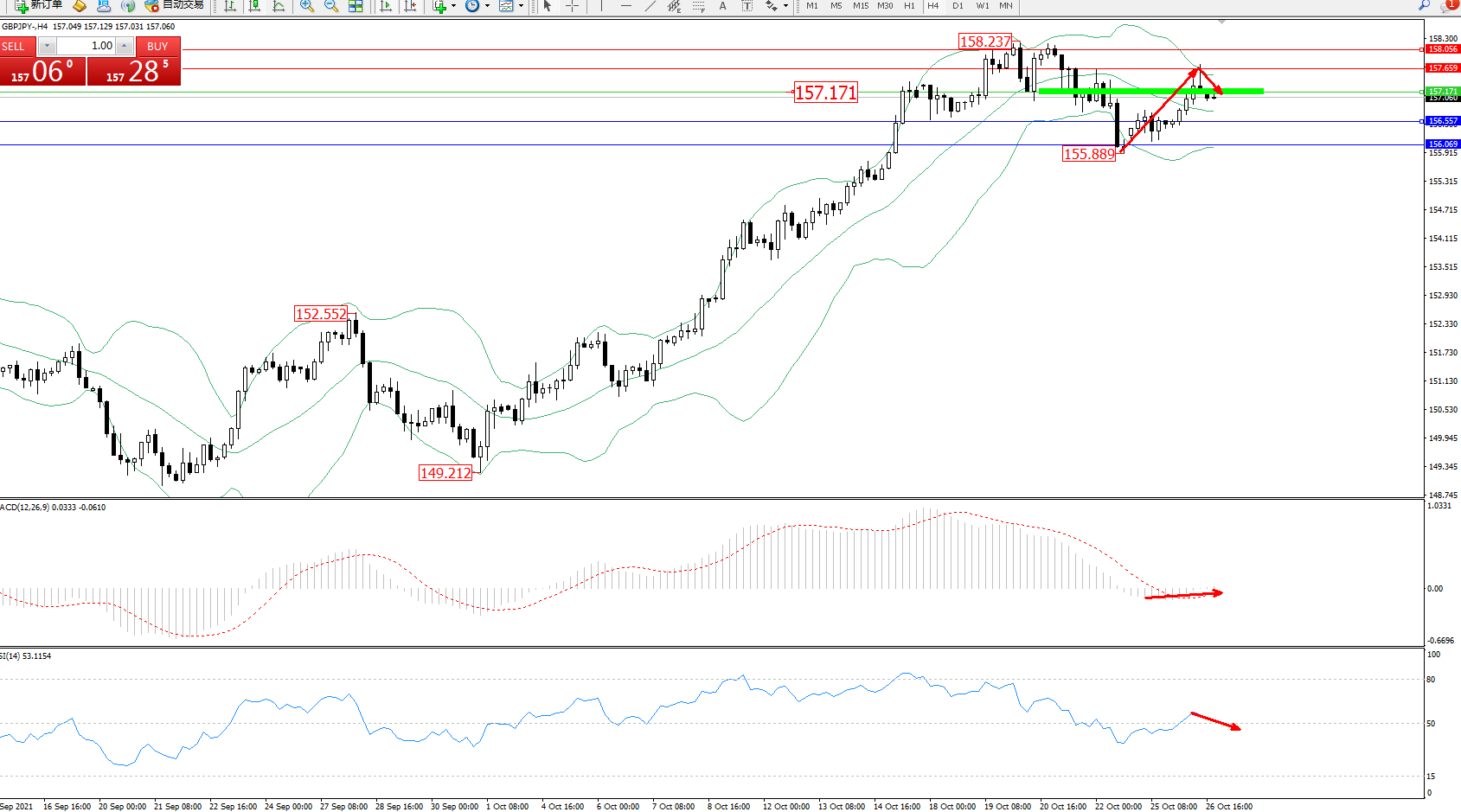 备选策略:157.171上方看涨,目标157.659、158.056