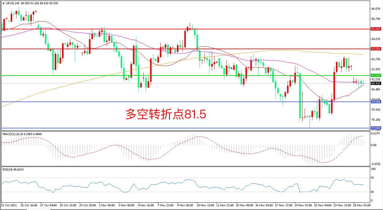 4小时图看,油价延续高位震荡,整体波幅不大,200周期均线成为上方阻力,81.5成为下方支撑,MACD红柱增加,RSI指标走平,日内震荡上行概率较大。