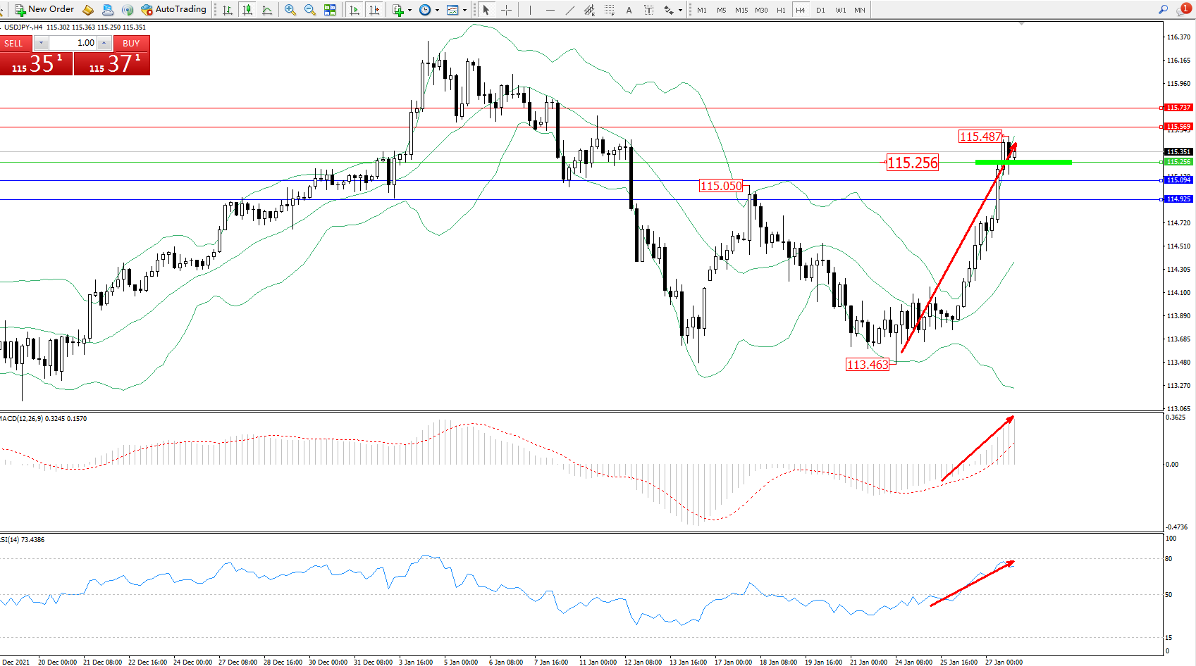 交易策略:115.256上方看涨,目标115.569、115.737