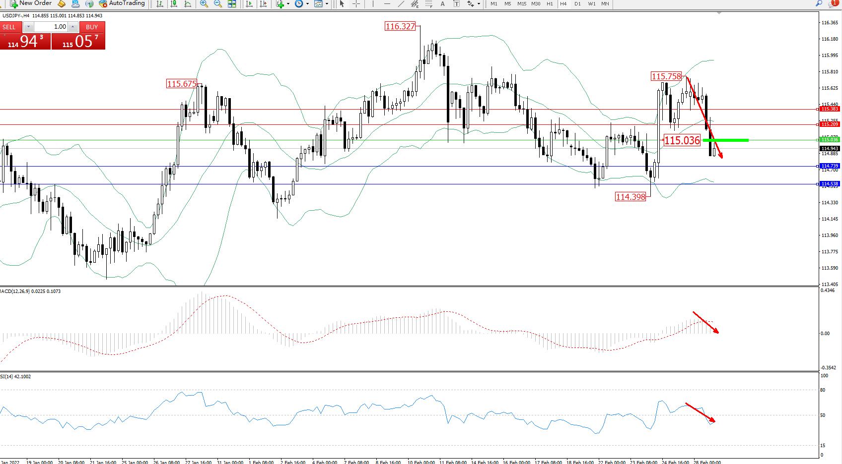 交易策略:115.036下方看跌,目标114.739、114.538