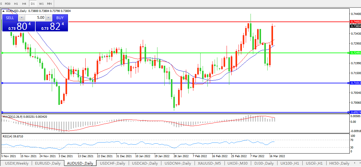 澳元领涨,迈向2020年以来最大两日涨幅,两天累计上涨2.5%;澳元兑美元涨1.2%至0.7375;澳元兑日元上涨1%至87.446,为四年来的最高水平。美联储周三自2018年以来首次加息之后,澳洲联储主席Philip Lowe可能面临更大的提前加息压力。