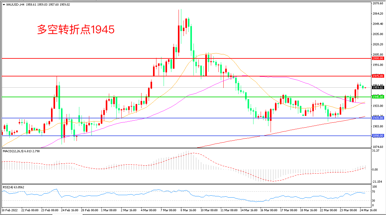 周四(3月24日),俄乌谈判仍未现进展,西方对俄制裁加码,北约峰会决定增加对乌克兰的援助、军事部署和北约成员国的军费,现货黄金在避险情绪的推动下再度走高,收报1958.17美元/盎司。假若俄乌冲突推动的资源品供应链危机爆发,美国乃至全球的经济衰退或将提前到来,乱世端倪出现之时,黄金依然是市场上最“可靠”的资产。