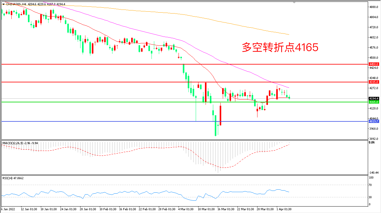 4小时图看,沪深300触碰55周期均线后回落,短线走势疲软,4165成为多空分水岭, MACD绿柱缩短,RSI指标走平,日内延续震荡概率较大。