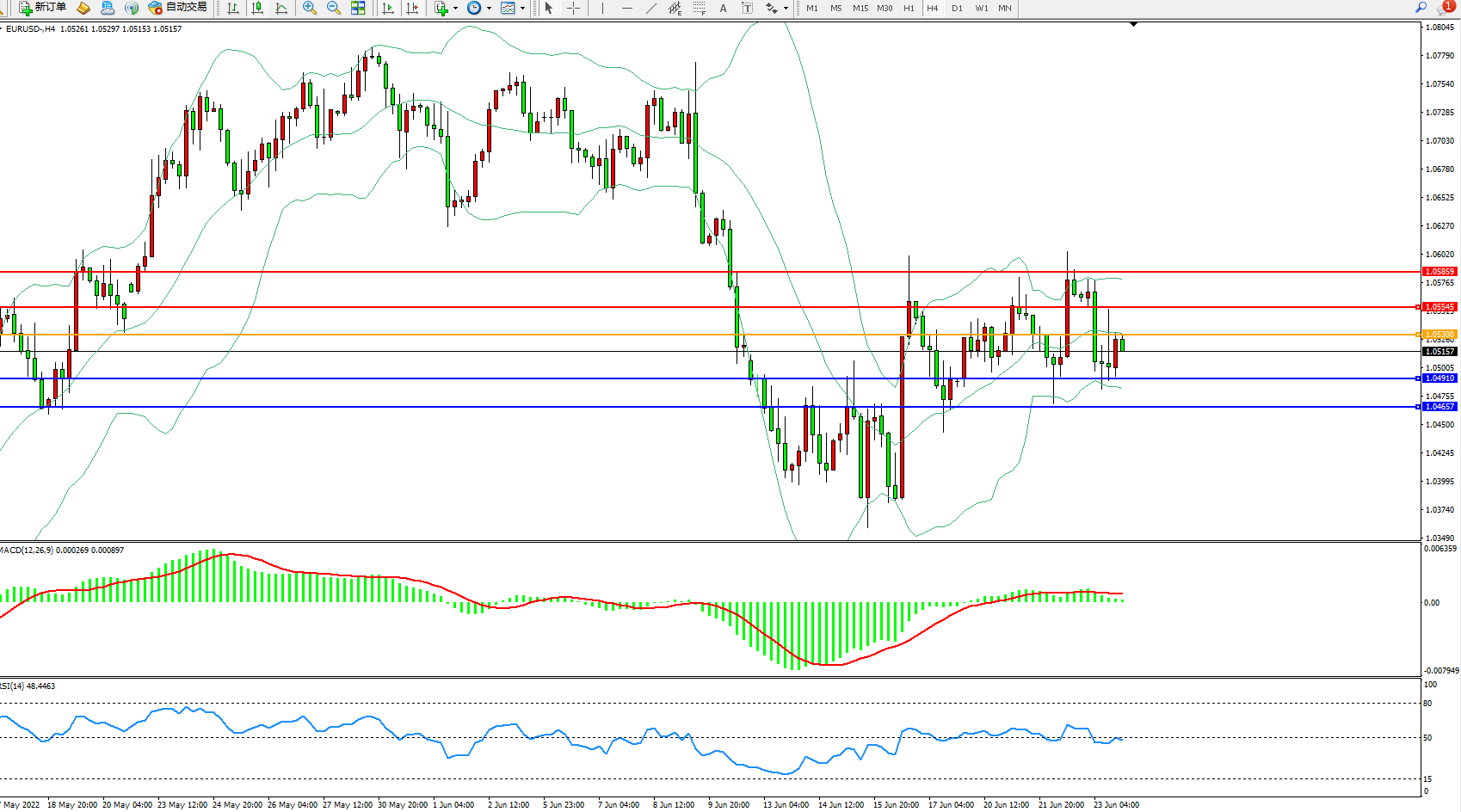 4小时图看:长时间维持在布林带指标通道中上轨区间持续震荡,布林带指标呈收口走势后平移中,MACD指标处于0轴线上側弱势徘徊,RSI指标处于50均衡线附近窄幅整理;
