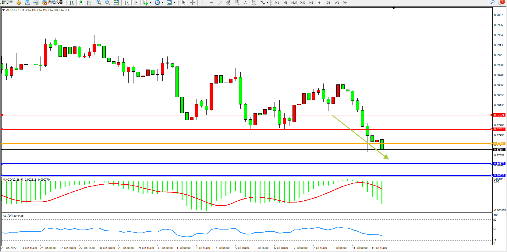 澳元美元AUDUSD——4小时K线图显示: