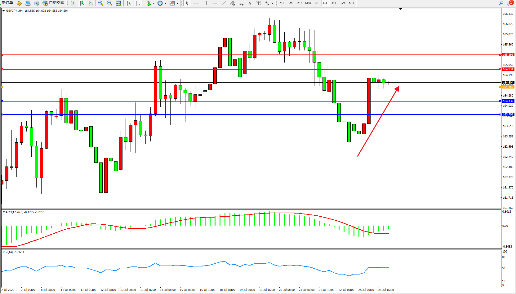 交易策略:164.489上方看涨,目标164.931、165.296