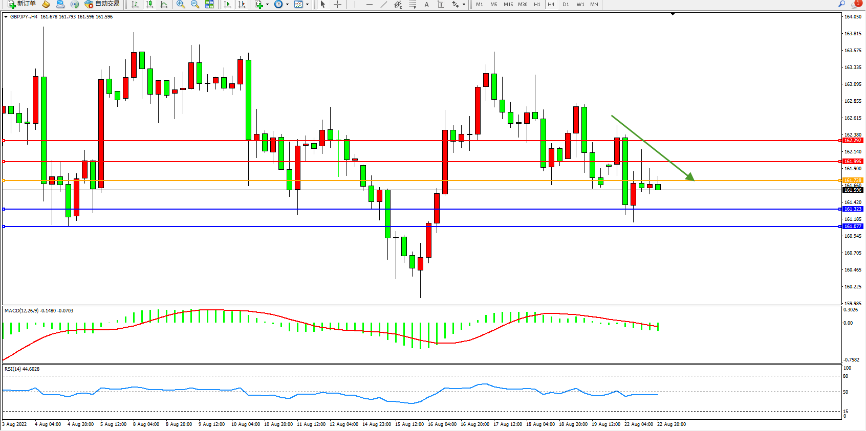 交易策略:161.728下方看跌,目标161.323、161.077
