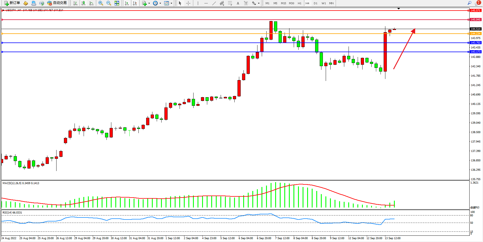 交易策略:144.234上方看涨,目标145.045、145.571
