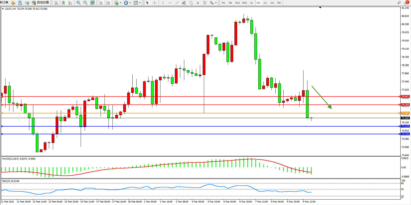 交易策略:75.806下方看跌,目标75.129  74.733